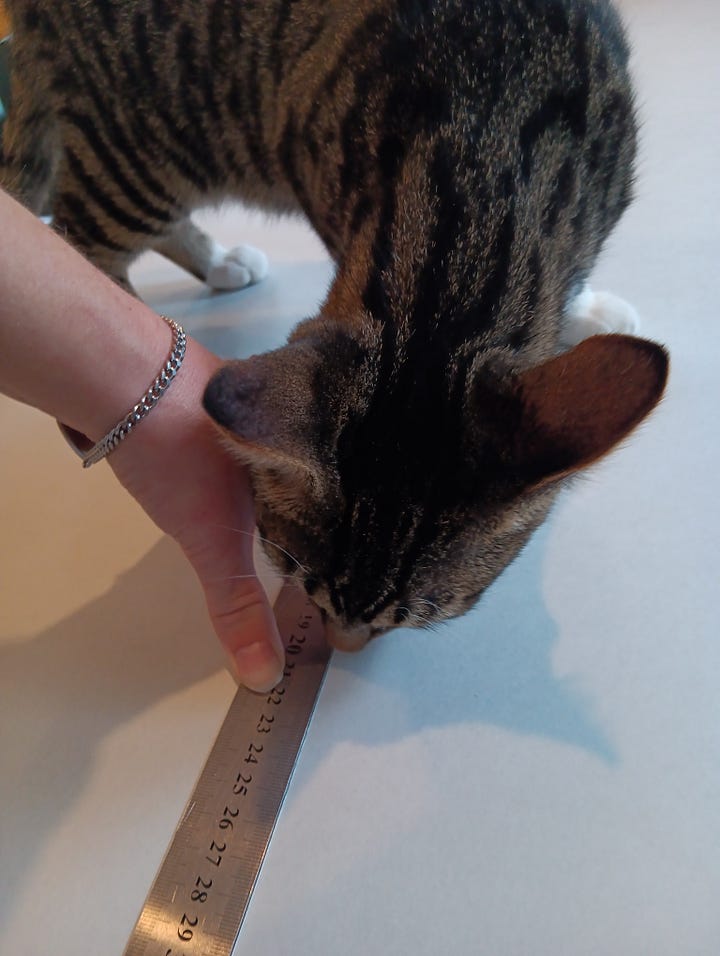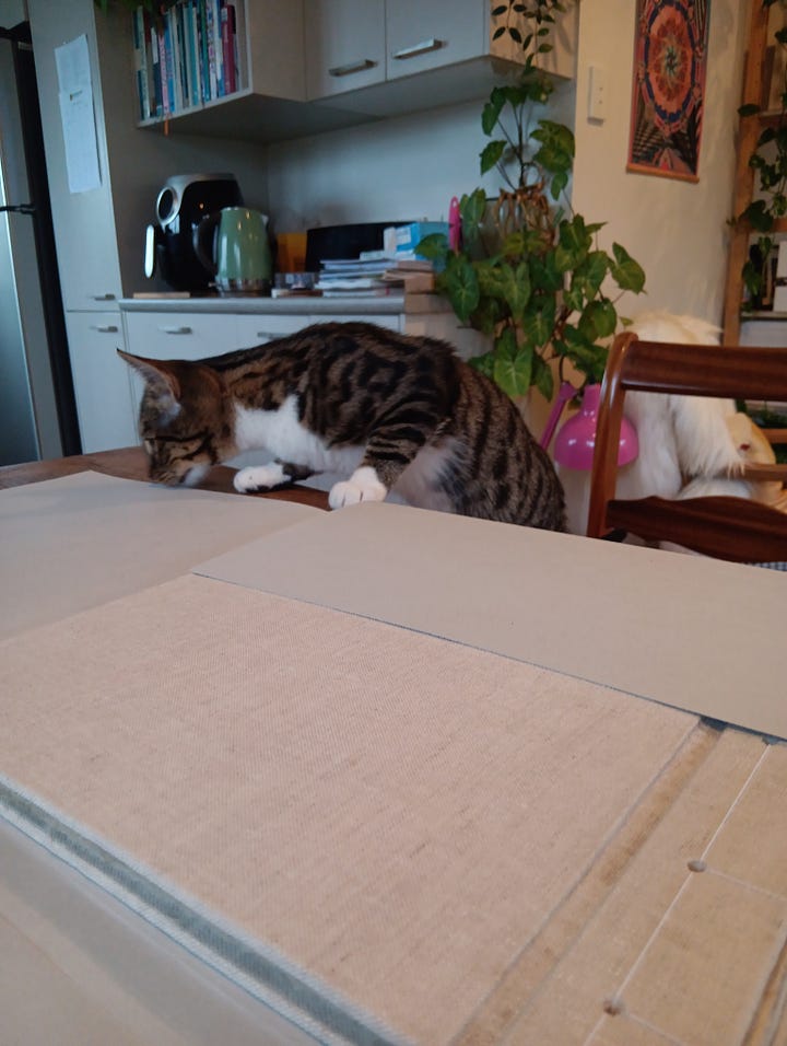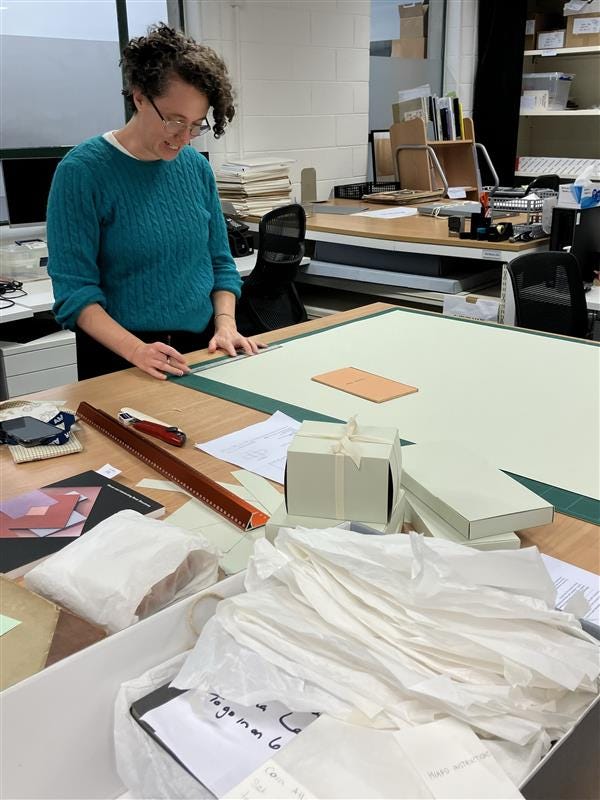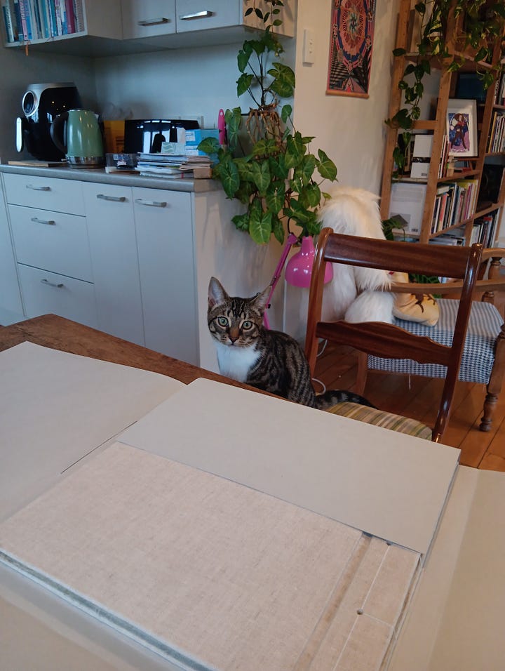 Making the boxes at home has a very different set of challenges to making them at the museum: a little cat named Bobby thinks he should be involved.