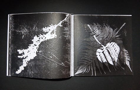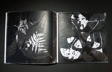 This month I bound a new book – a record of my printing over the last few months. My printing processes at home produce cast-off prints when inking and preparing the botanical specimens, as well as incidental prints of inked plants that reach off the page. There are also embossed prints, where an un-inked leaf or frond leaves a deep impression in the paper, and letterpress text test prints. In the first half of the book the pages are largely white – leaves printed around the edges, text, and embossing – while the latter half is blank ink overlaying black ink overlaying black ink from multiple printing sessions. Fern fronds, kanuka, kawakawa and ginkgo all overlaying each other, combining and creating new forms and shadows.