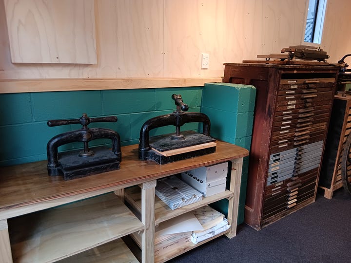 On Monday I spent my first day printing in the studio: a quiet happiness in solitude, paper, and ink. I have made a number of new prints specifically for Printopia this weekend where I will have a stall at the print fair. Printopia is a three day festival of all things print running from Friday night through Sunday (2-4 May ’25) at Corban Estate Arts Centre in Henderson. Perhaps I’ll see you there?